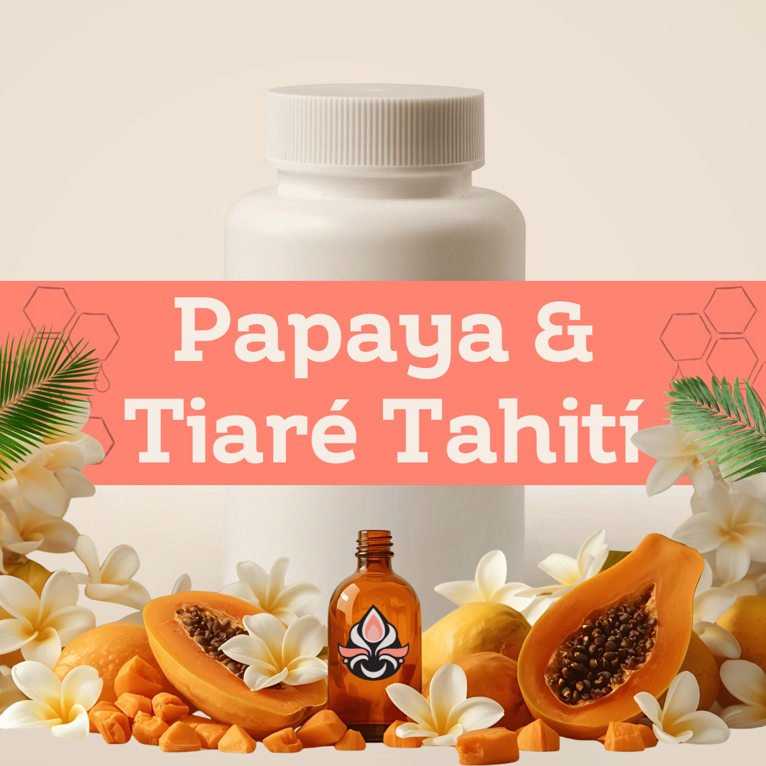 Blend que combina el aroma de la Papaya dulce, cremosa e intensa, con la flor Tiare de Tahití, que es una gardenia blanca delicada e intensa. Fragancia floral dulce.